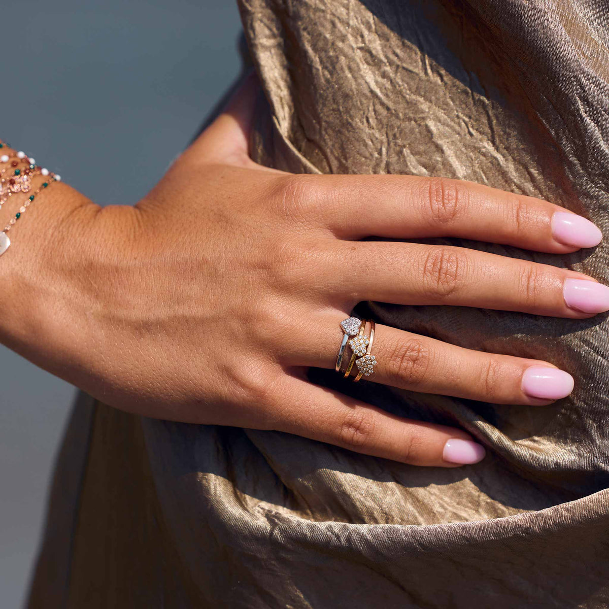 • Photo de la main d’une femme portant plusieurs bagues In Love Gigi Clozeau.
