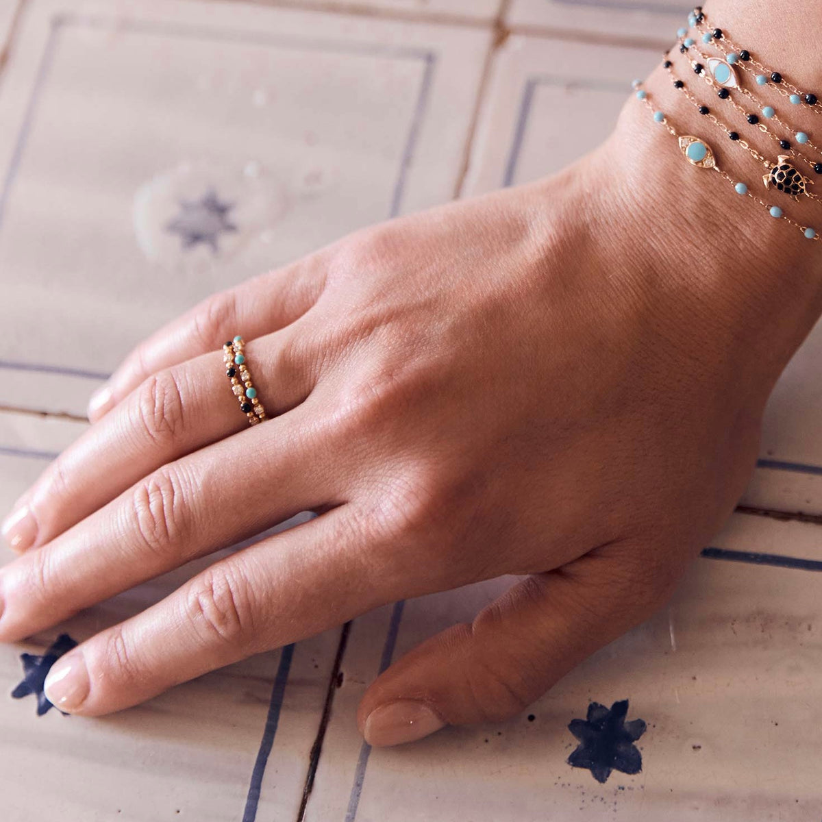 Photo de la main d’une femme portant deux bagues Gigi Clozeau de couleur turquoise et noire.