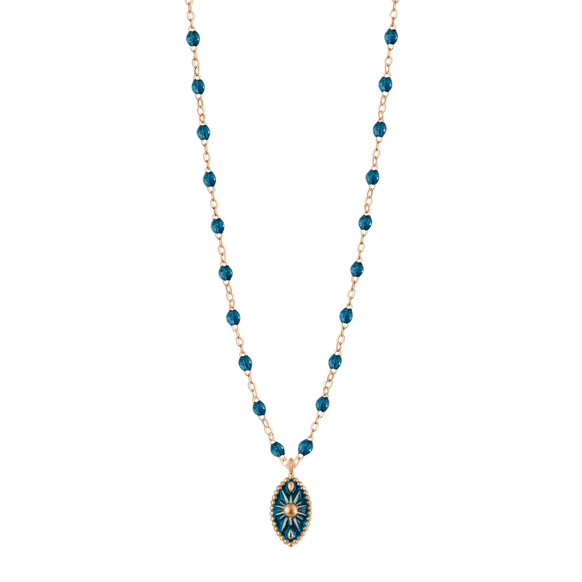 The Gigi Clozeau Karma necklace in 18 carat rose gold on a Classic Gigi chain, with elegant, Jungle pearls of resin. The perfectly placed, detailed pendant is a precious talisman, offering light and protection.