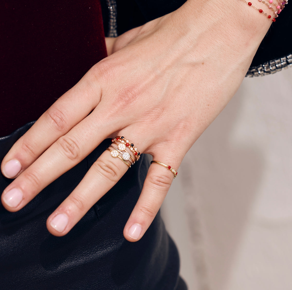 • Photo de la main d’une femme portant plusieurs bagues Gigi Clozeau.
