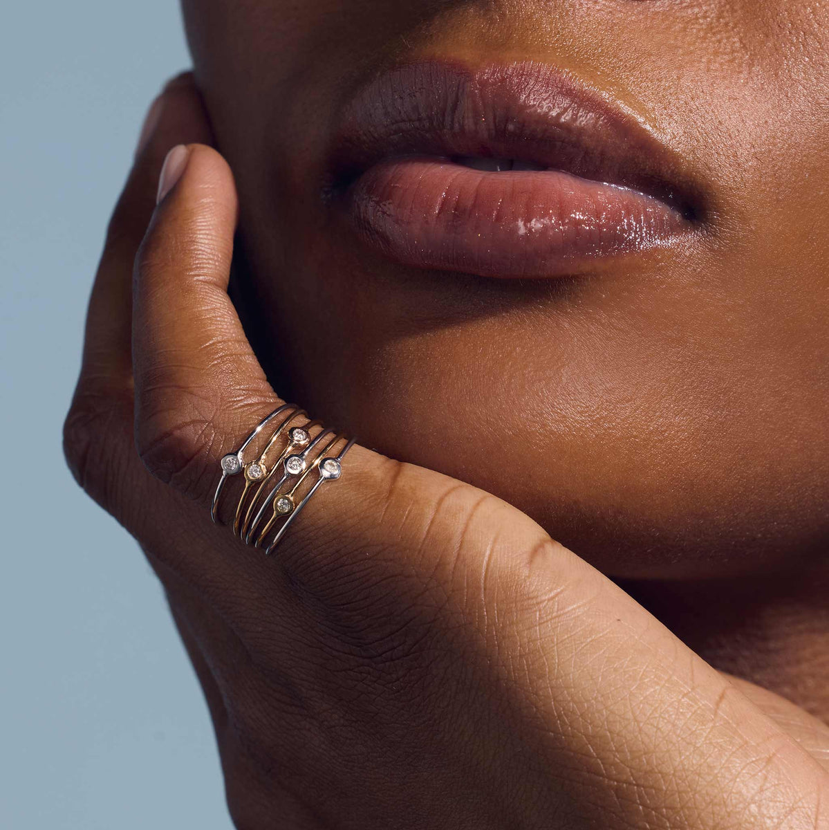 Photo de la main d’une femme portant plusieurs bagues Dot Gigi Clozeau.