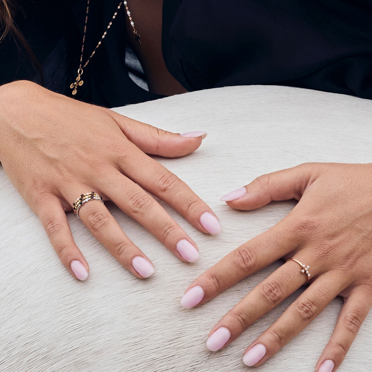 Photo de la main d’une femme portant plusieurs bagues Gigi Clozeau.