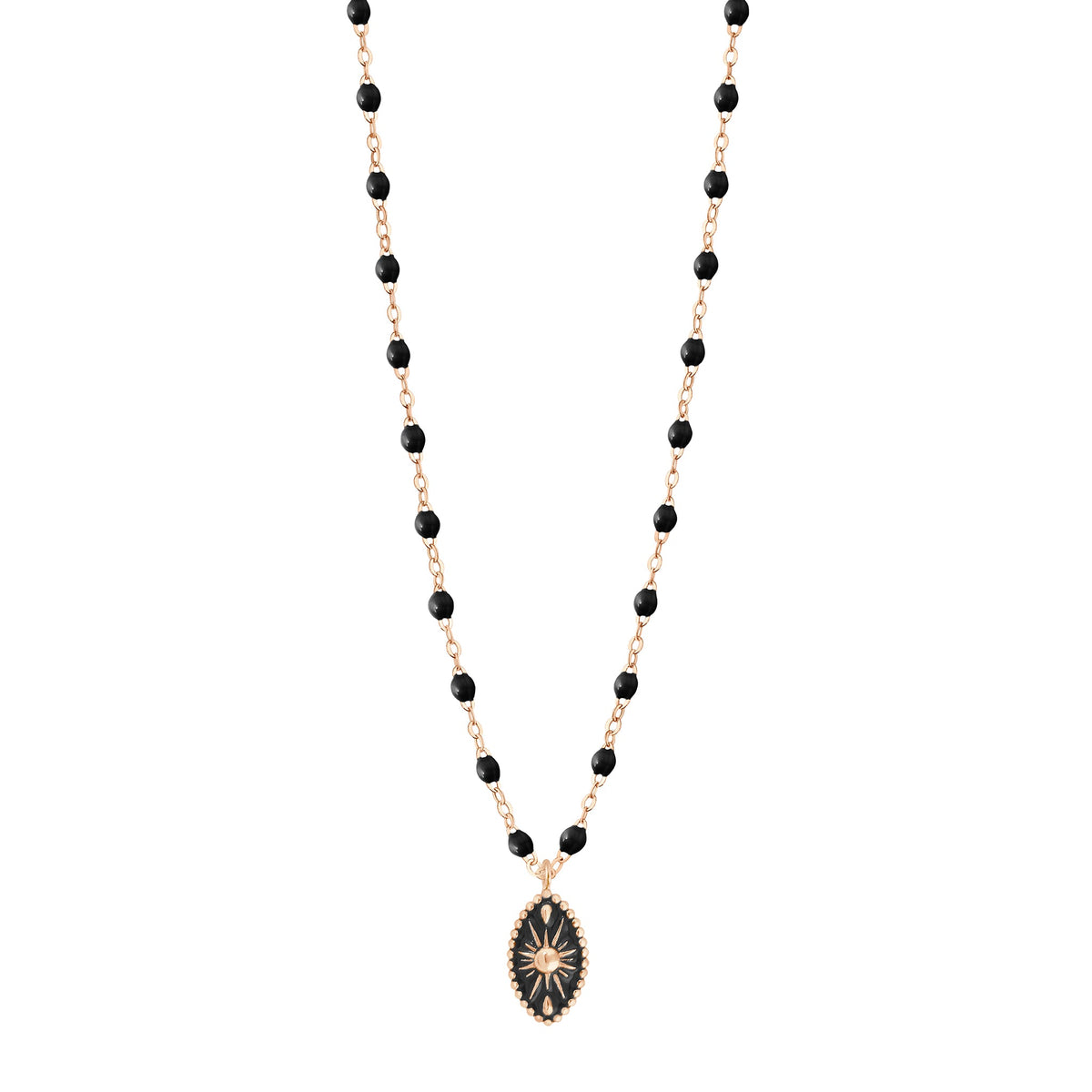 Die Halskette Karma Gigi Clozeau en Roségold 18 carats entfaltet sich an der klassischen Gigi-Kette, geschmückt mit eleganten schwarzen Harzperlen. Sein Anhänger mit fein perlierter Umrandung verkörpert einen kostbaren Talisman, zugleich schützend und strahlend.